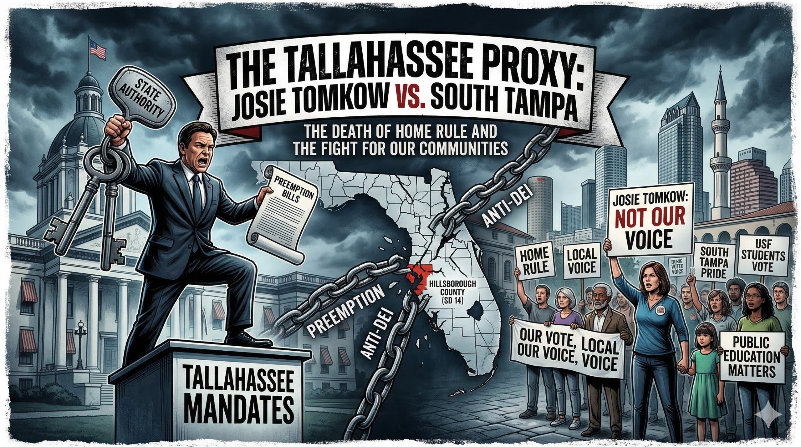 During her tenure in the House, Tomkow has been a reliable “yes” vote for a legislative agenda that systematically strips power from city halls and county commissions and consolidates it in Tallahassee. For the residents of SD 14, a district that includes the eclectic corridors of Downtown, the historic streets of South Tampa, and the diverse academic community of USF, Tomkow’s record is not just out of step; it is a direct threat to the very fabric of their neighborhoods.